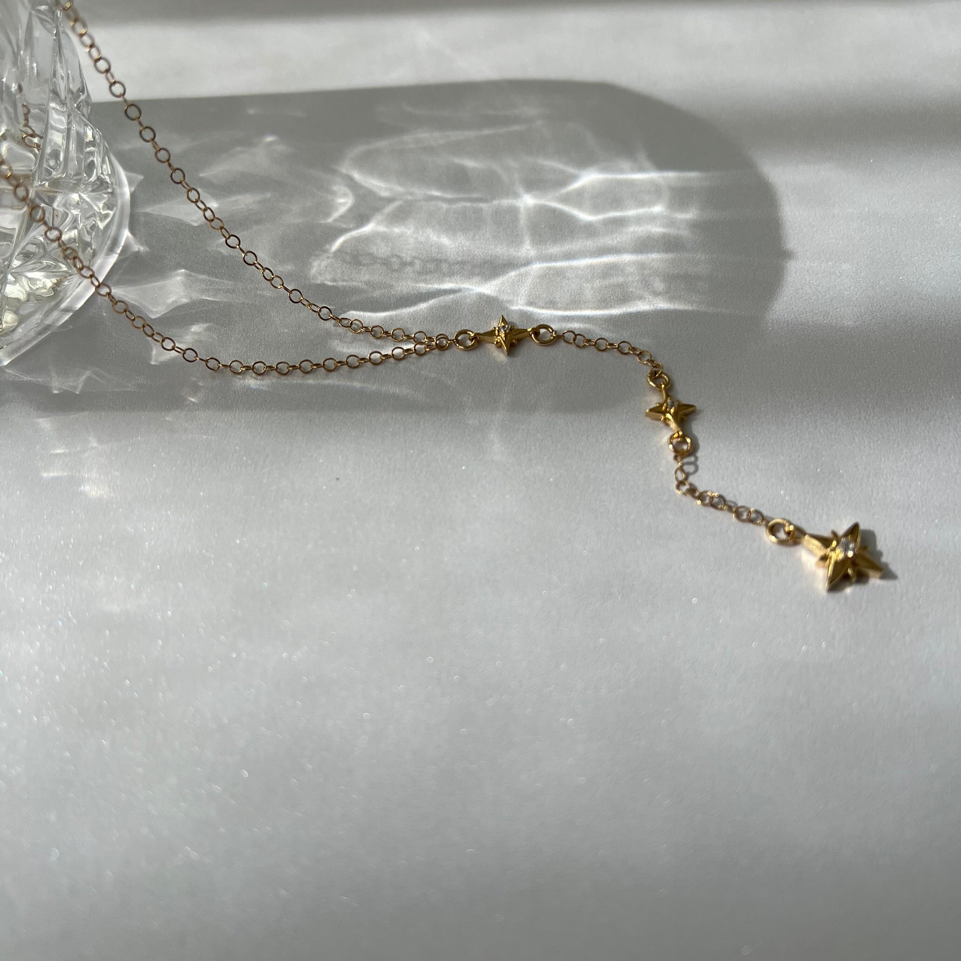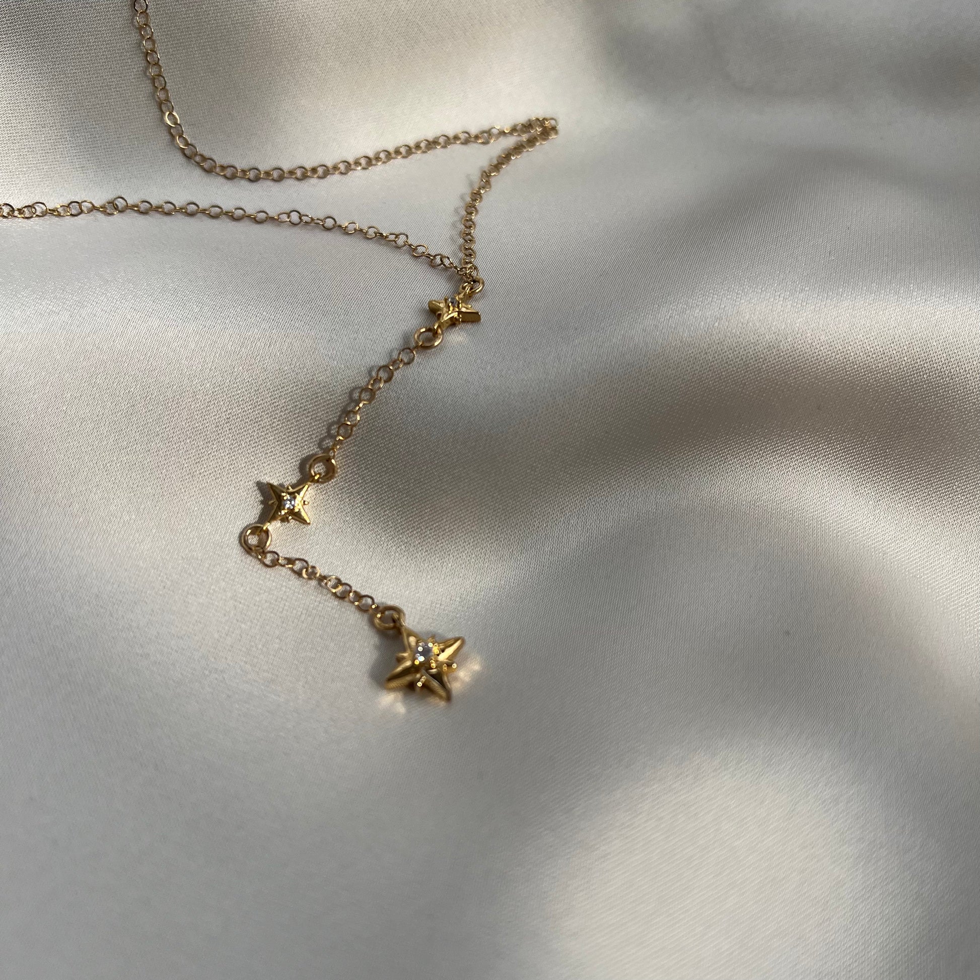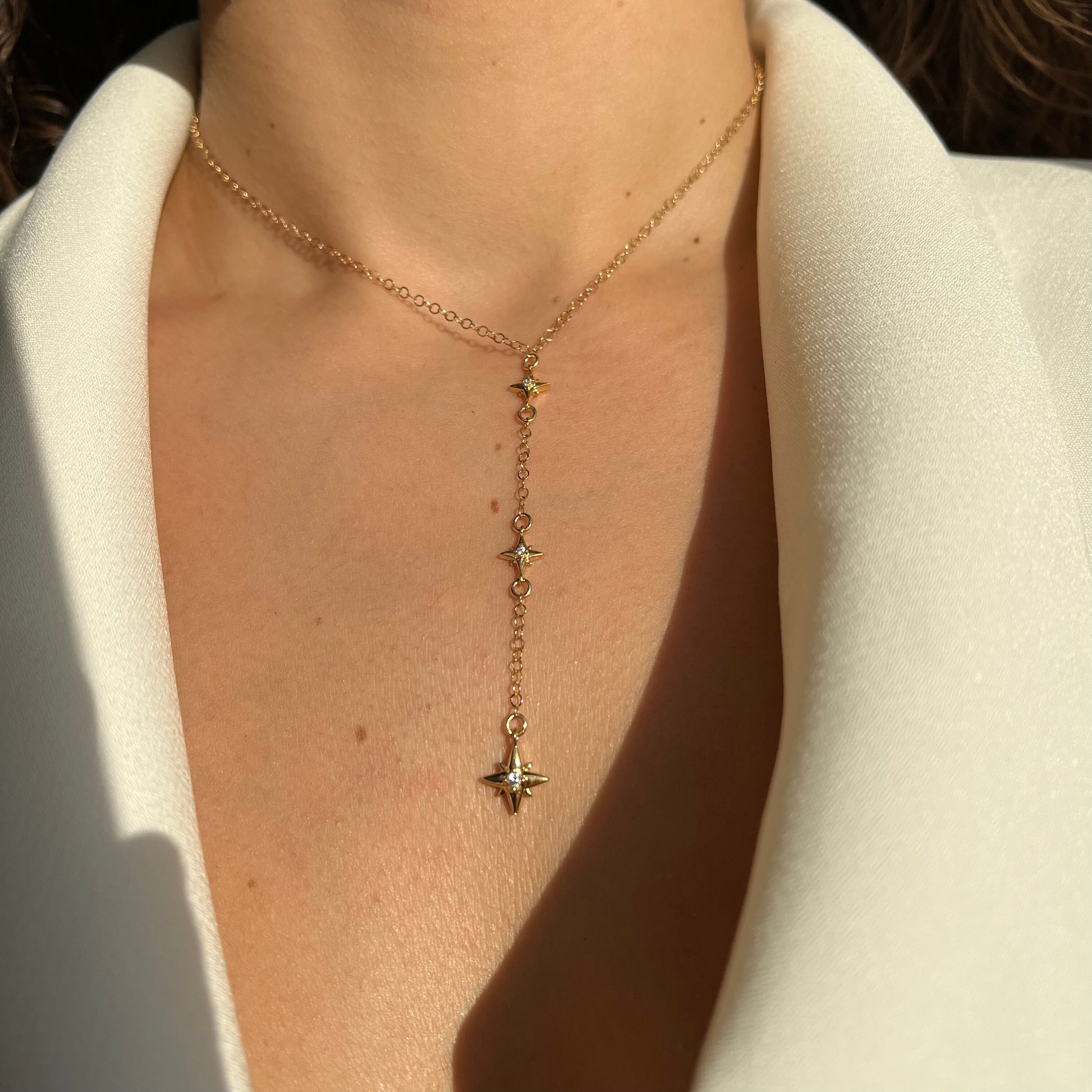שרשרת כוכב הצפון בזהב – שרשרת ארוכה ונשית עם שלושה תליונים מדורגים בגובה, שכל אחד מהם גדול מהקודם. עיצוב ייחודי ומרשים שמשדר אלגנטיות ומתאים לכל אירוע מיוחד.